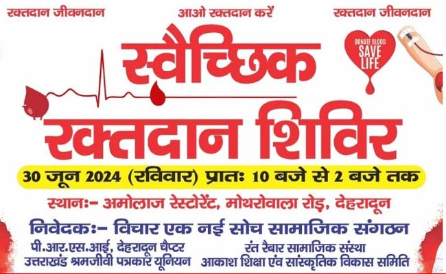 देहरादून। सामाजिक संगठन विचार एक नई सोच और पीआरएसआई देहरादून चौप्टर सहित 8 अन्य संस्थाओं के सहयोग से रविवार 30 जून को एक विशाल स्वैच्छिक रक्तदान शिविर का आयोजन किया जा रहा है। रक्तदान शिविर में एकत्रित रक्त को दून मेडिकल कालेज को दिया जाएगा। दून मेडिकल कॉलेज के प्राचार्य डा. आशुतोष सयाना ने कहा कि यह रक्त अस्पताल में जरूरतमंद मरीजों के साथ ही गरीब मरीजों को निशुल्क उपलब्ध कराया जाएगा।