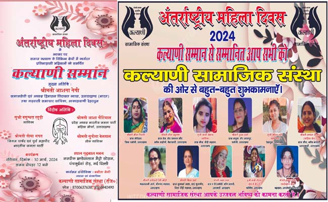 कल्याणी सामाजिक संस्था की अध्यक्षा एवं संस्थापिका बबीता नेगी ने बताया कि संस्था द्वारा वर्ष 2020 में पहली बार अन्तर्राष्ट्रीय महिला दिवस पर “कल्याणी सम्मान समारोह” का आयोजन किया गया था। इस आयोजन का मुख्य उद्देश्य उन महिलाओं को एक बड़े मंच पर सम्मानित करना है, जो विषम परिस्थितियों में समाज के विभिन्न क्षेत्रों मे उल्लेखनीय कार्य कर रही हैं। तब से लेकर लगातार हर वर्ष अन्तर्राष्ट्रीय महिला दिवस पर कल्याणी सामाजिक संस्था मातृशक्ति के सम्मान में समारोह आयोजित करती आ रही है। इस बार संस्था आगामी 10 मार्च को नई दिल्ली के पंच्कुईयां रोड़ स्थित गढवाल भवन मे पांचवां “कल्याणी सम्मान समारोह” आयोजित करने जा रही है।